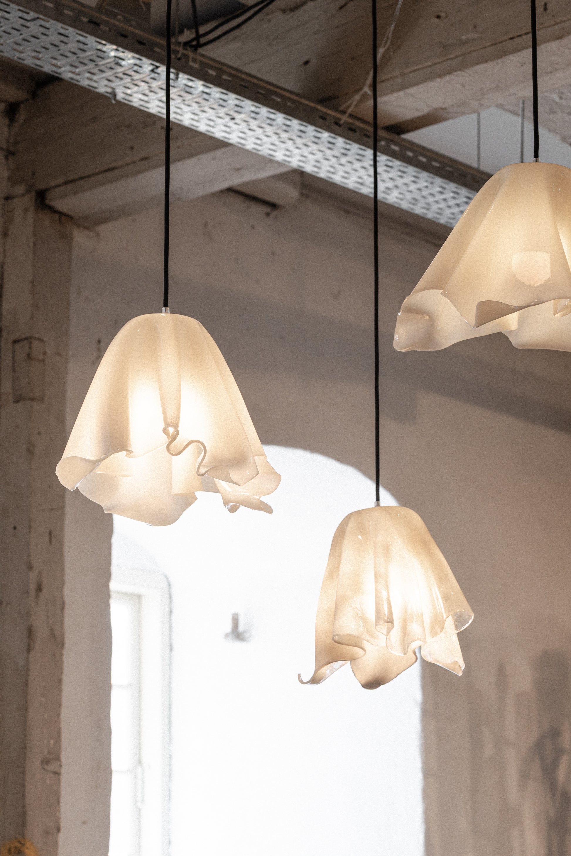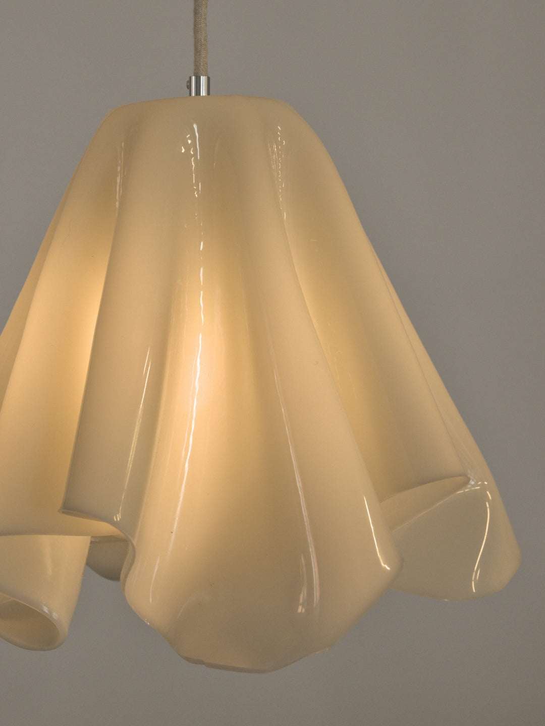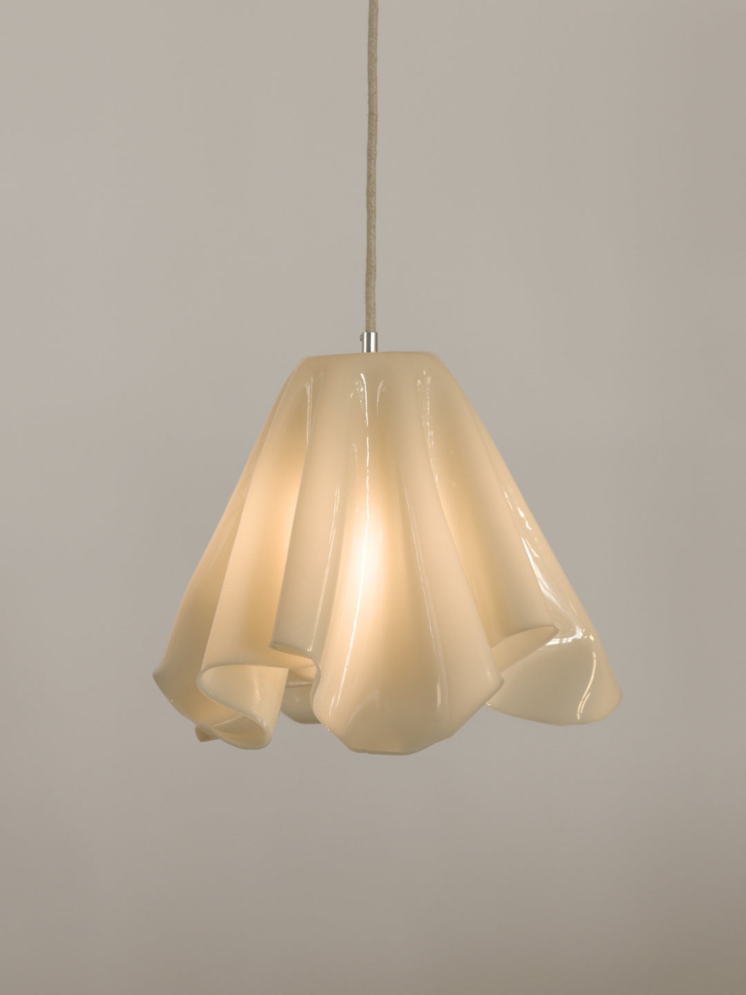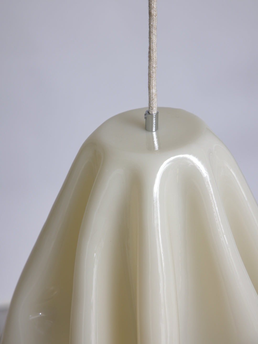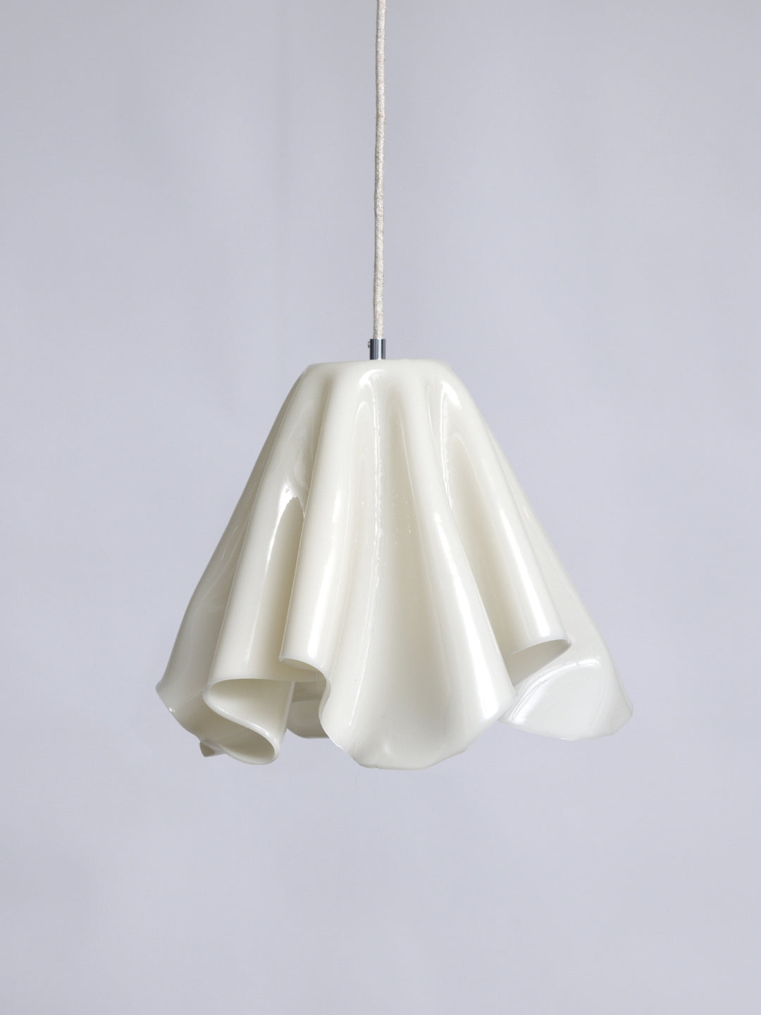 An organically shaped pendant lamp in a soft, off-white hue – handmade with care and without the use of energy during the curing phase.