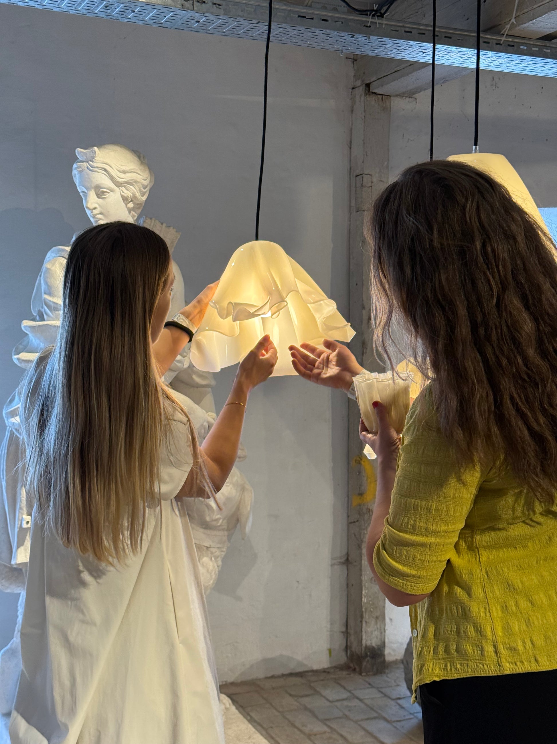 LIGHT & HEAT: Only LED lights may be used, as the material cannot tolerate open flames or heat. When the LED is turned on, a soft, warm glow is created that enhances the organic expression of the work and changes it depending on the light and surroundings.